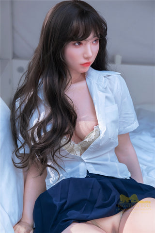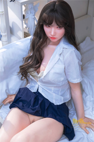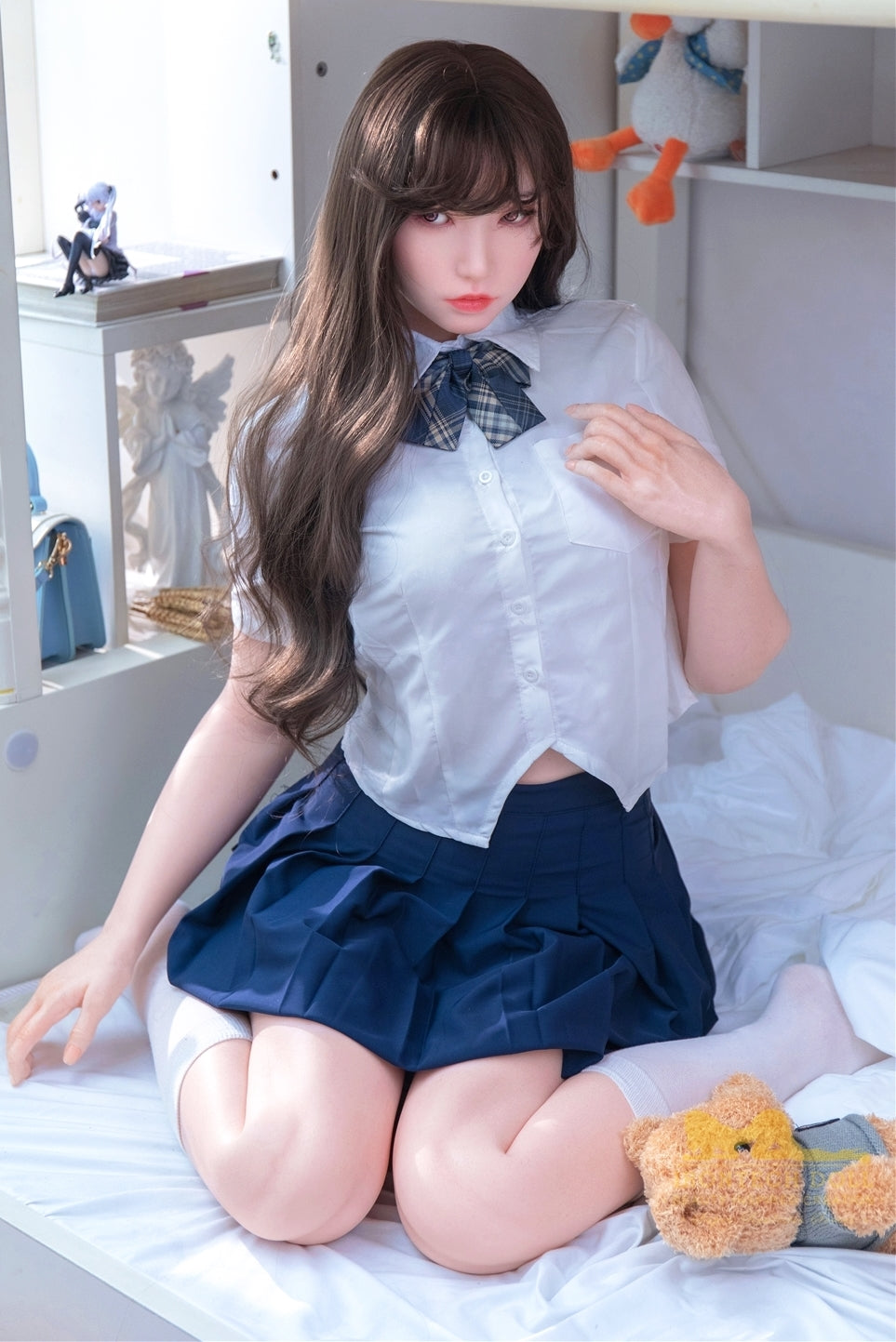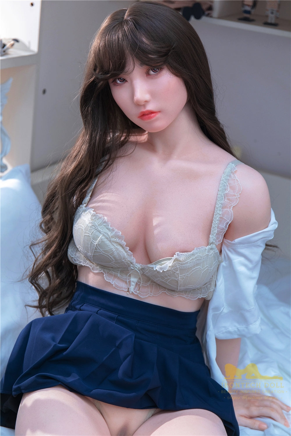 This Chinese sex doll offers a high degree of realism. Her body and head are made of high-grade silicone, imitating human skin and flesh with natural light and slightly darker tones, makeup, pores, wrinkles, morphology, and blood vessels. She has dark areolas and nipples, gel-filled breasts, and a wig (implanted hair on the scalp and pubic area is possible for a supplement). The advanced internal EVO skeleton offers support with a special mechanism that allows disassembling the head for easier cleaning, shrugging shoulders, and double joints for more realistic movements and poses.