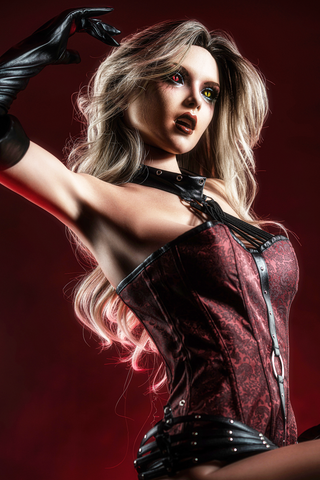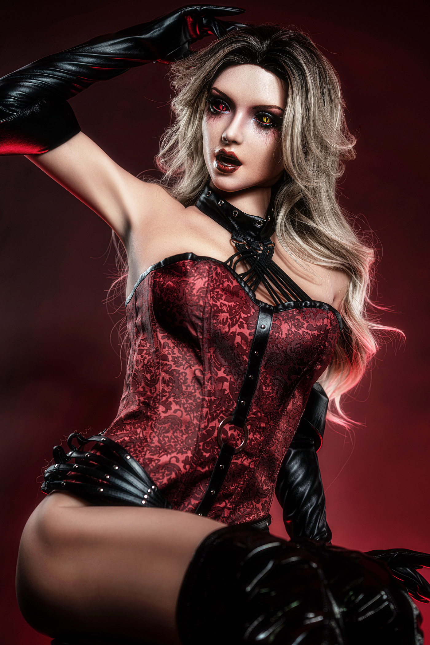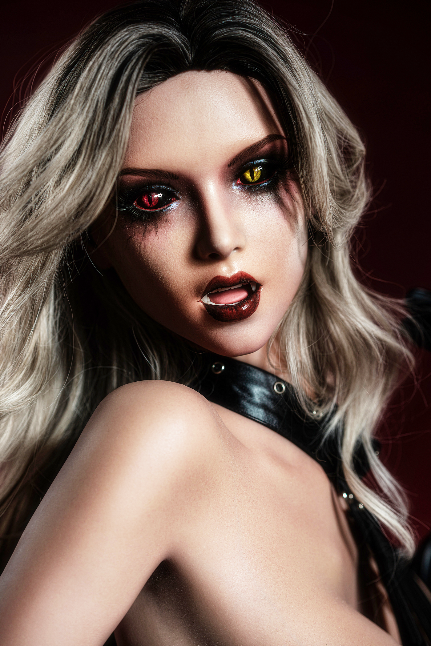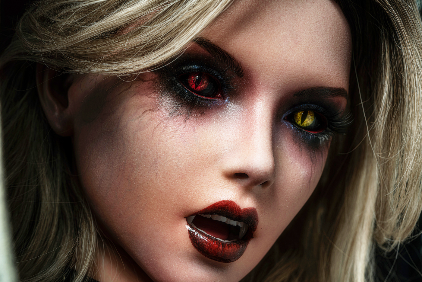 - Detailed skin with pores, wrinkles, blood vessels, and vampiric makeup.