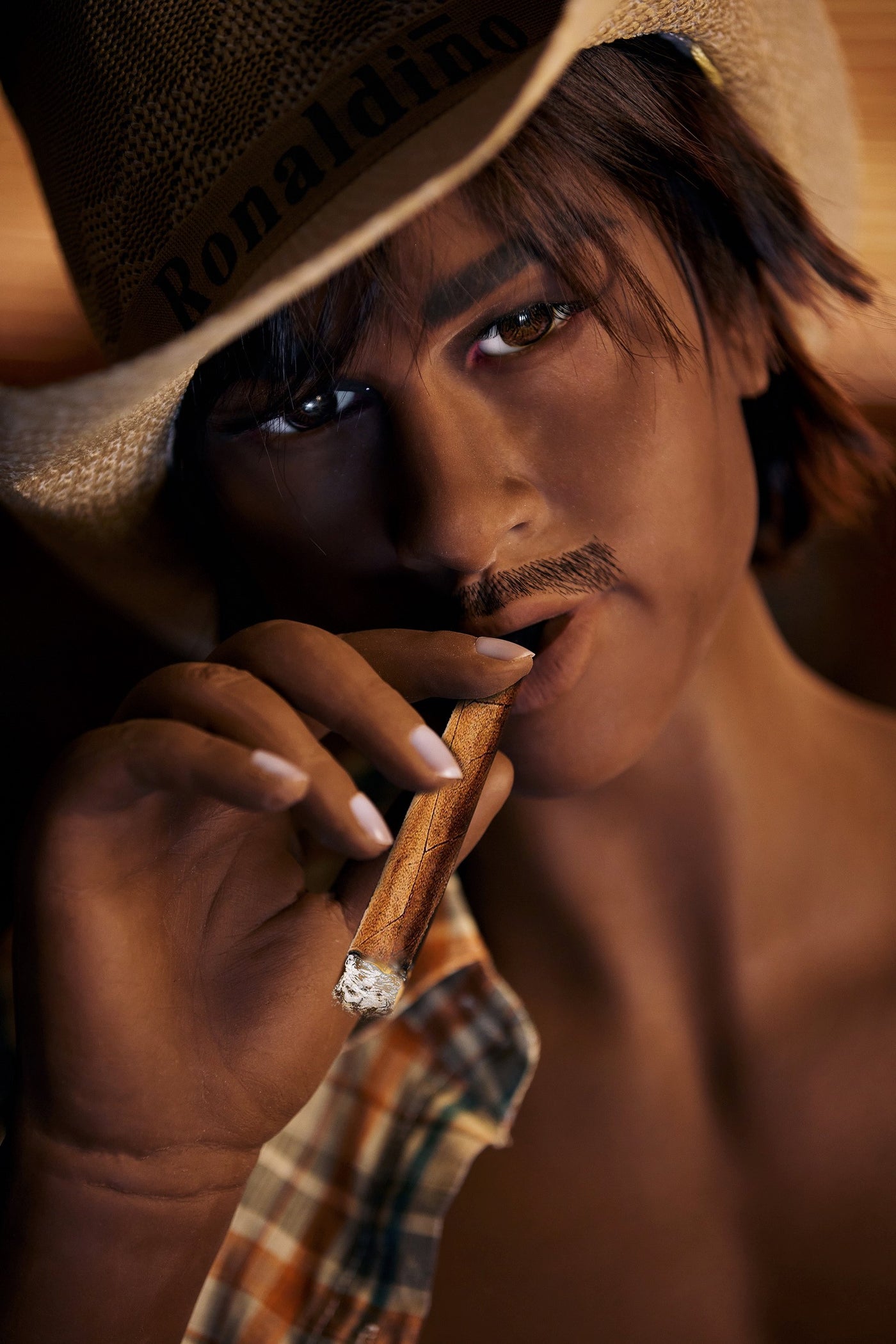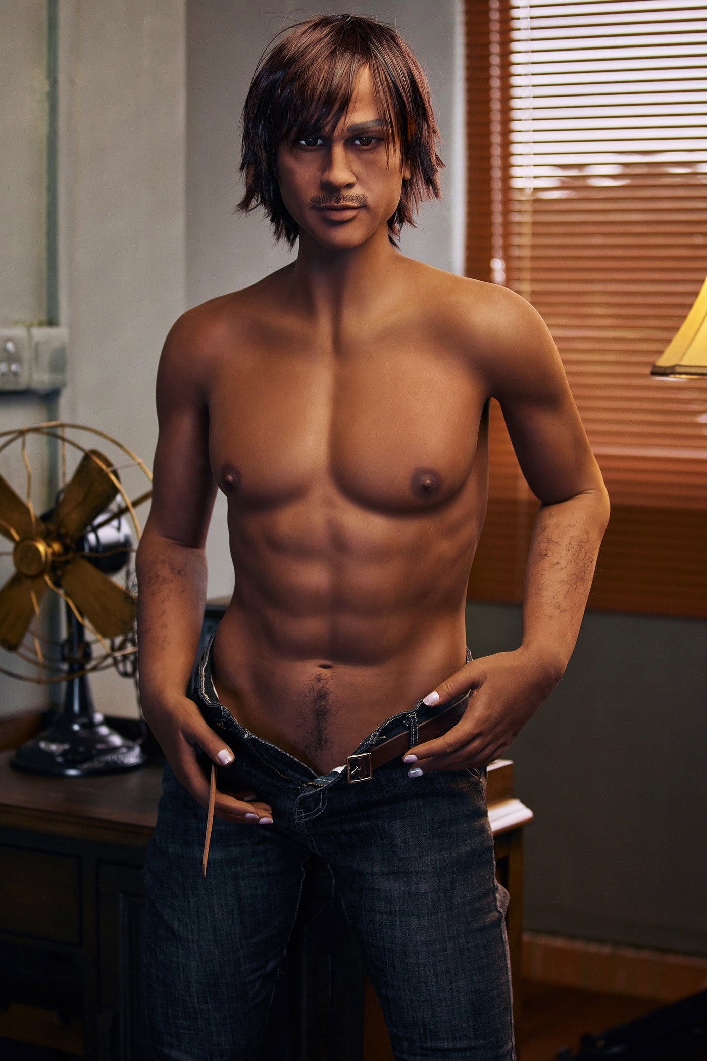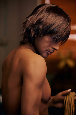 This Latin American Mexican male sex doll is made of high-quality medical-grade TPE, perfectly safe for human use, with an internal stainless-steel skeleton that allows him to adopt any human pose. He has implanted hair on certain parts of his body for added realism. He comes with oral and anal orifices and a 6” (15 cm) erect penis. The flaccid penis is optional for an extra cost.