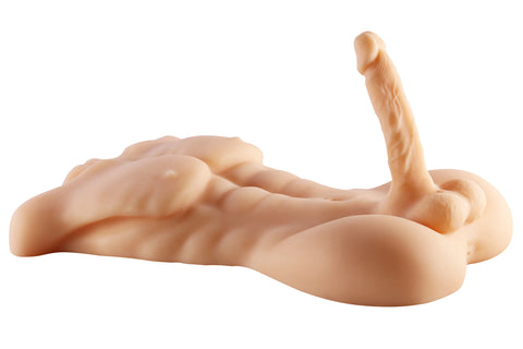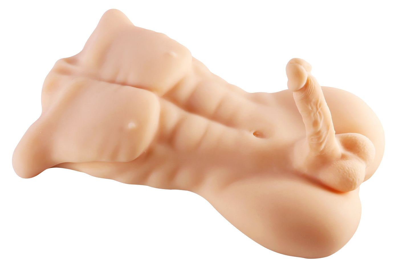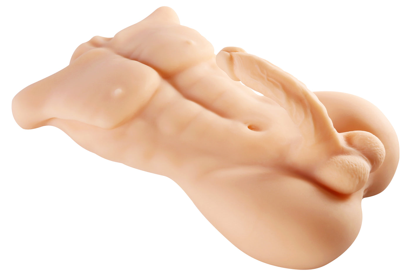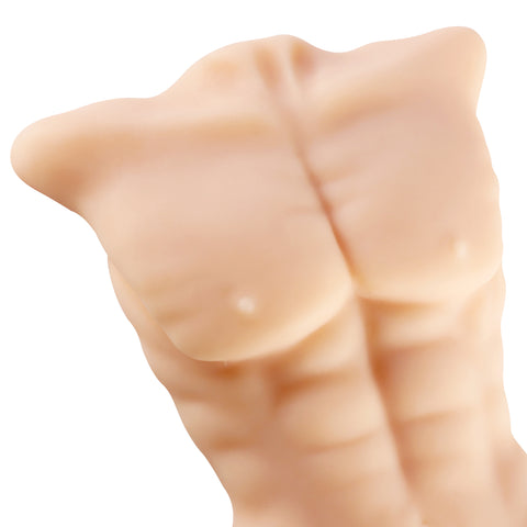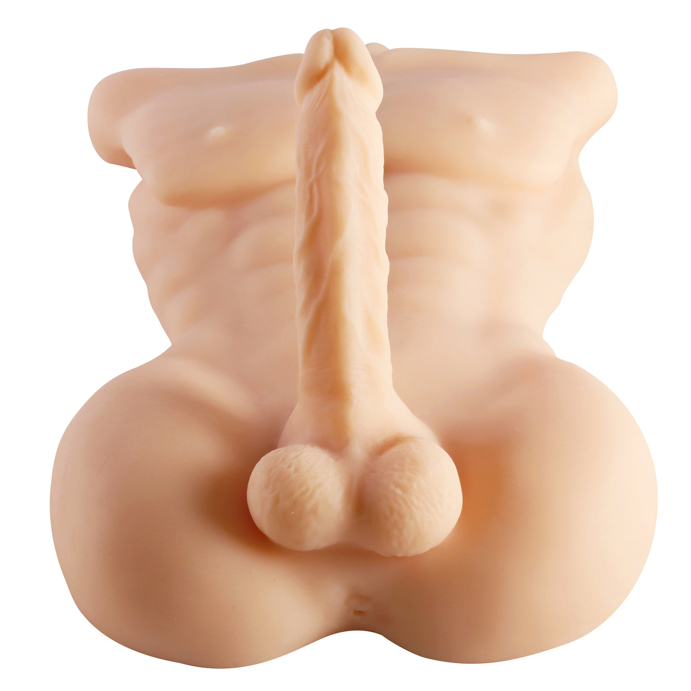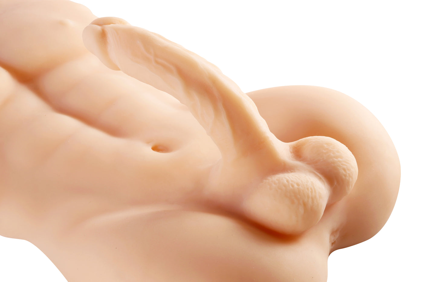 Pectoral and abdominal muscles have been reproduced with amazing realism, as well as the penis and testicles. The back part is completely flat, making it perfect for placing it on the bed or on any uneven surface. Unlike most dildos, it does not need a suction base, and it offers much more stability and resemblance with reality, showing the upper part of a man's body where to place your hands and even rub yourself for more excitement.