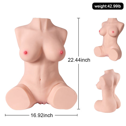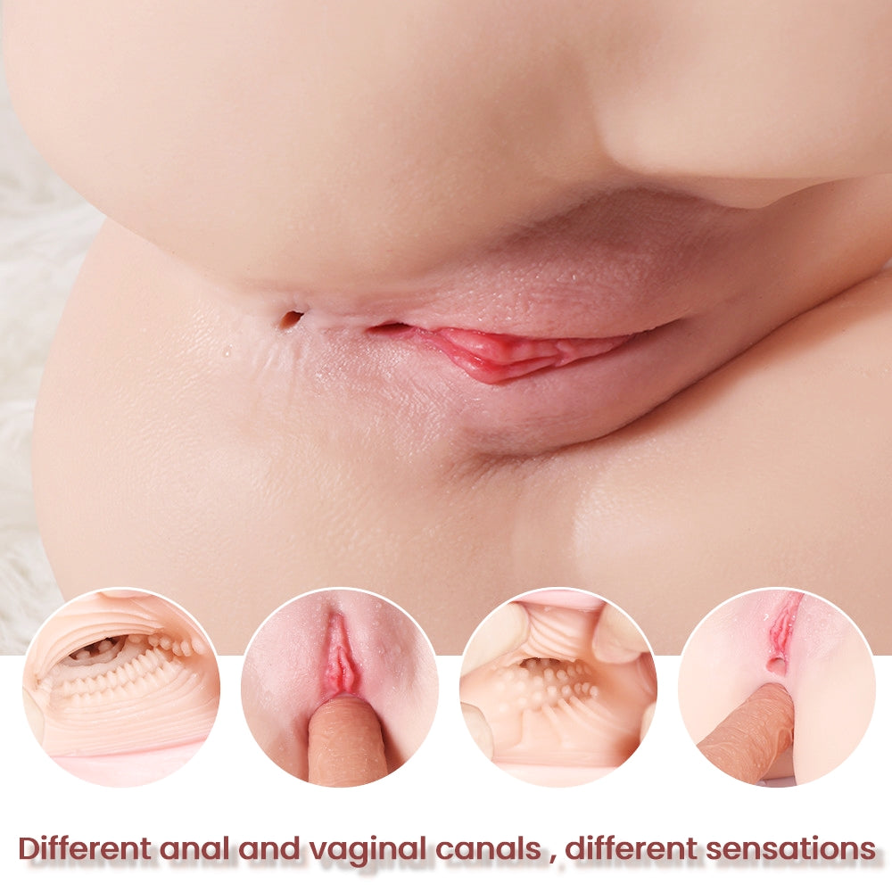 However, it is still a 1:1 scale replica of a real woman's body, as you can realize by the extraordinary detail of the neck, contoured back, beautiful breasts, sexy ass, juicy, and attractive anal ring. The surface recreates human skin with pores and wrinkles. And the vaginal and anal canals offer double-fun with two different forms of sexual stimulation.